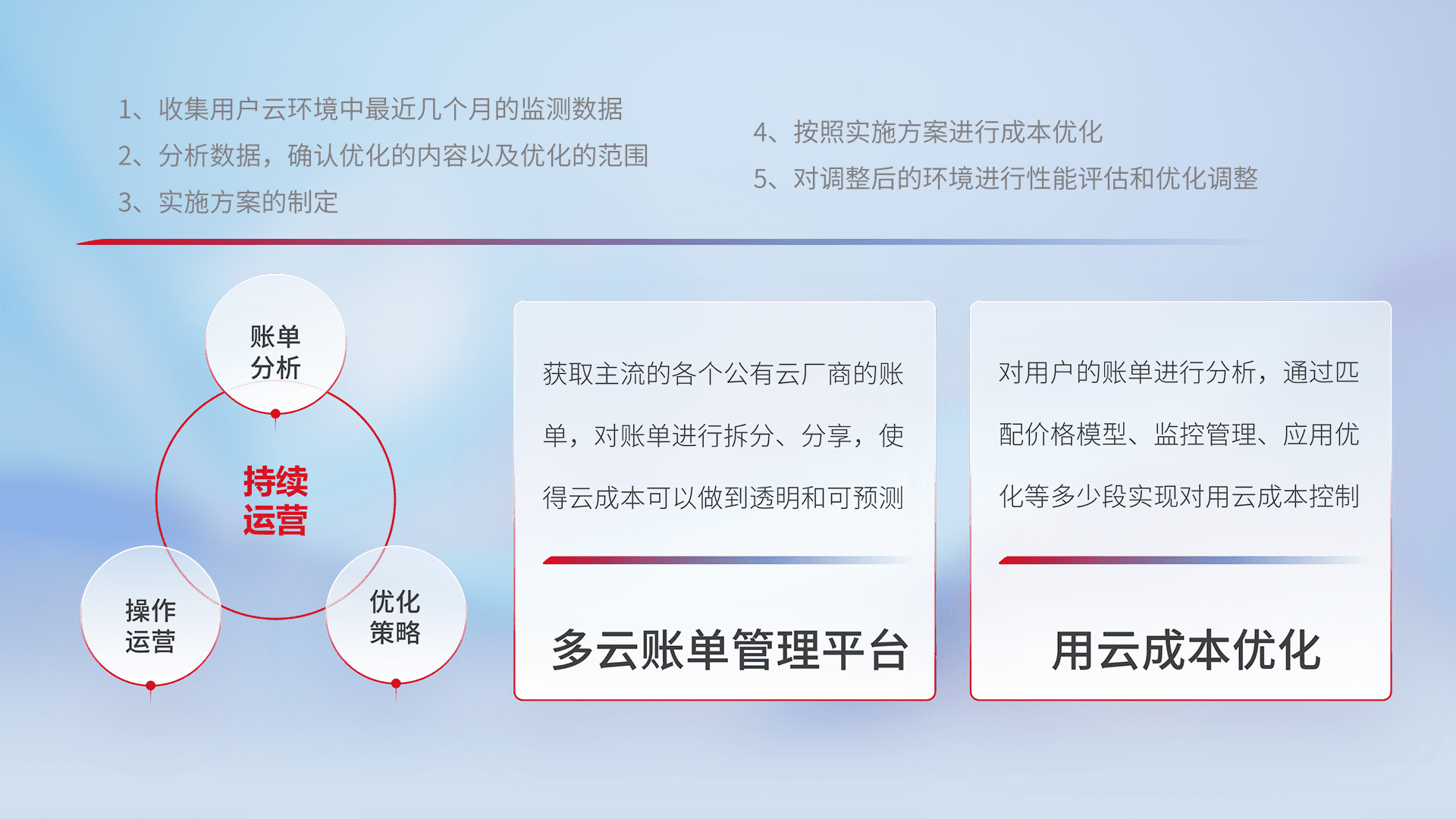 通过多云纳管,,,以统一的资源数据模型把客户的云资源进行抽象和封装,,,,进而实现对多云资源的统一操作,,,保障云资源管理的可靠性、、、、稳定性与可用性。。量身定制化运维内容,,配置、、、开发运维、、补丁管理、、备份、、、监控、、认证和访问管理、、、审计和日常巡检等,,保障在用云过程中的可靠度,,,,稳定度以及高可用率。。。